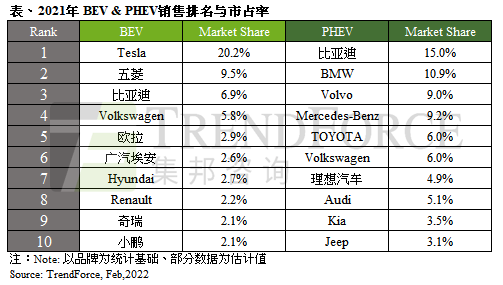 2021 年新能源汽车销售总量达 647 万辆,插电混合式由比亚迪夺冠