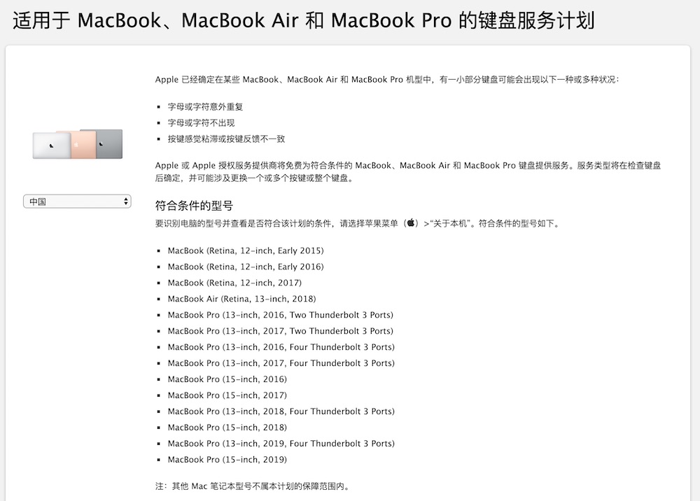 值得注意的是,机型列表中涵盖了第一代至第三代蝶式键盘,阐明它们都有潜在问题。苹果去年在蝶式键盘中加入了硅胶薄膜,但对键盘的改善作用仍旧不是很抱负。