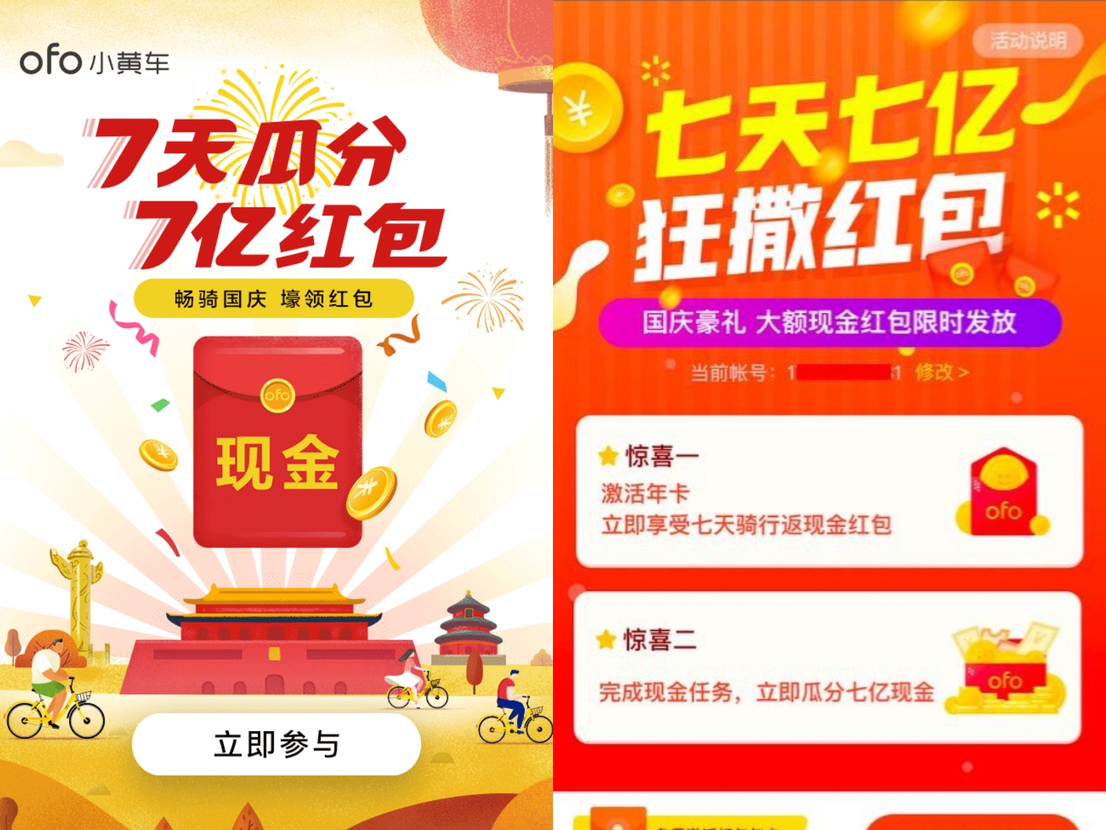 继续撒钱:ofo国庆开启新一轮现金补贴,7天7亿红包