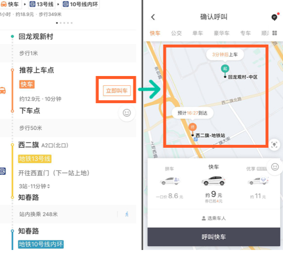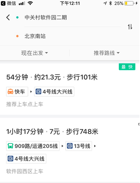 除了多种出行形式的一站式拼接,滴滴在本次晋级中又做了更多的体会优化。在传统的出行信息服务中,公交、自驾、单车、叫车会涣散在不同的界面,用户需要在不同的界面切换才干比照不同的交通出行计划。本次滴滴的换乘计划将公交、地铁、打车(现在支撑快车)、单车等多种出行计划差异化的在同一个页面展现。在经过比对出行时刻、价格、步/骑行间隔,用户能够在相对差异化的计划中挑选最合适自己的计划。
